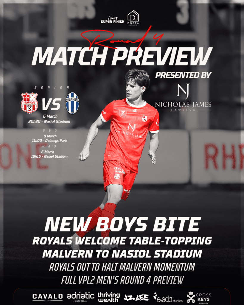 Essendon Royals host Malvern City FC at Nasiol Stadium this Friday night (8:30pm) in the second of three scheduled home fixtures at the venue before the return to Cross Keys in April. This is a ticketed event, with tickets available at the gate.
